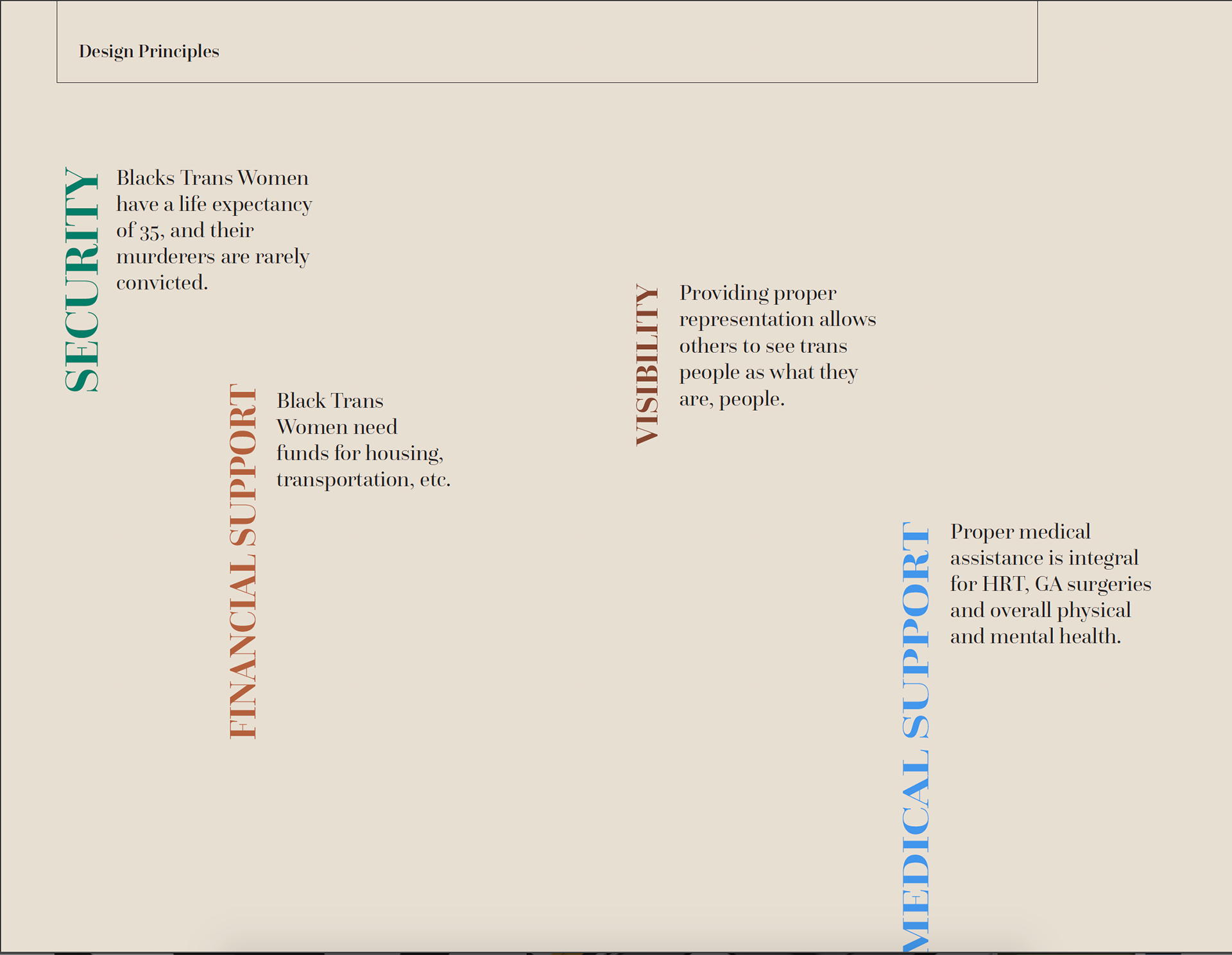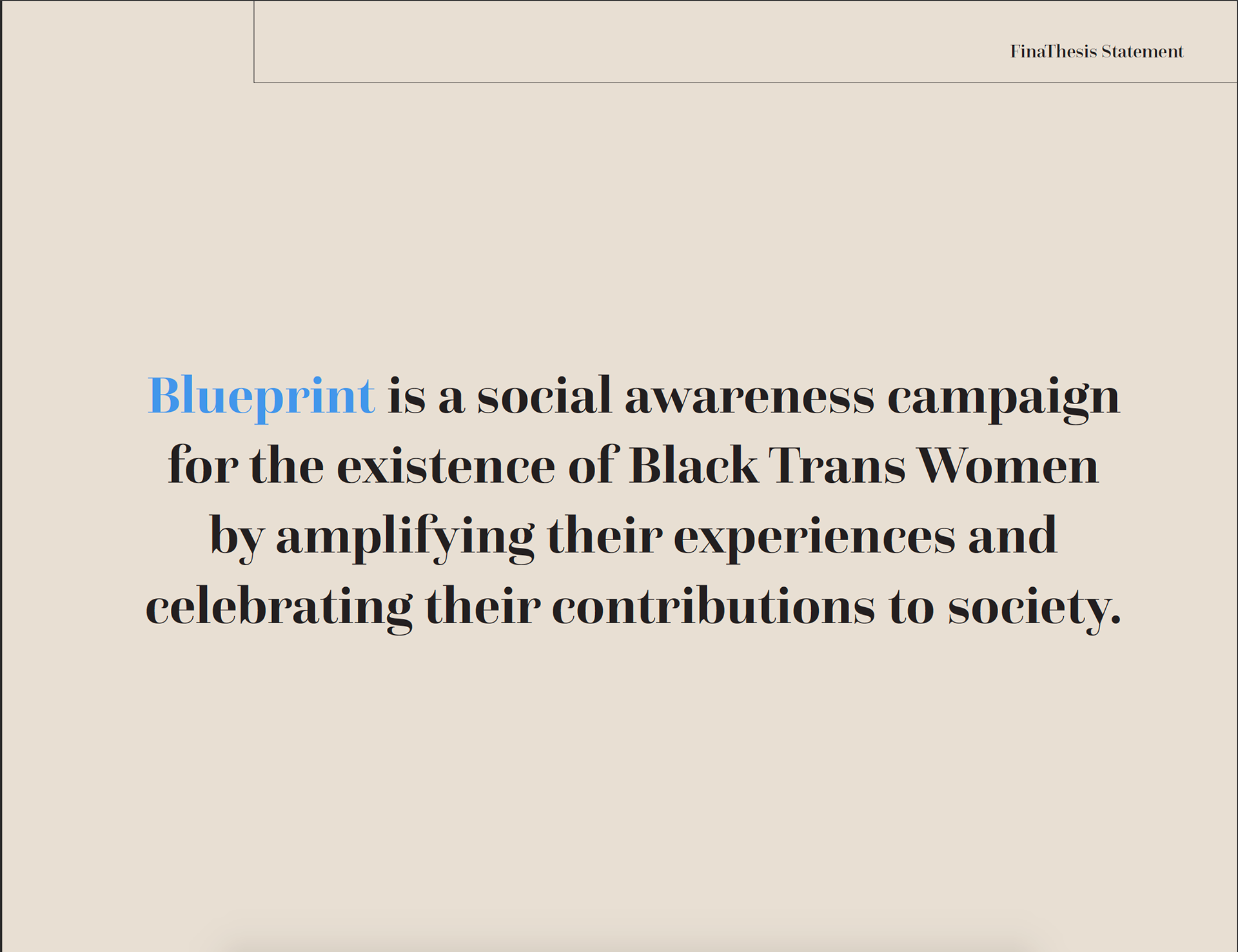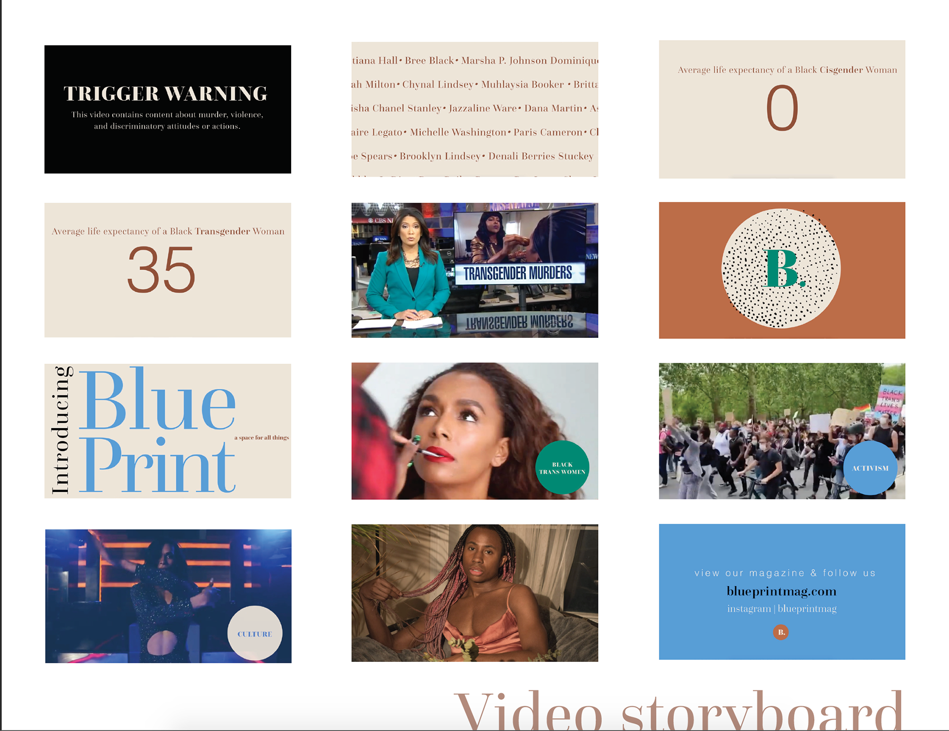 My senior thesis was a heartfelt tribute to Black Trans Women, emphasizing the profound significance of their lives and experiences. Titled "Blueprint," this project envisioned a fictitious brand dedicated to amplifying the voices of the most marginalized through a sophisticated editorial lens. After extensive research, I produced three comprehensive design deliverables. The project features meticulously crafted magazine spreads, a transformative Instagram makeover, and compelling posters that collectively narrate the myriad stories of these women. This work not only highlights the importance of representation but also showcases the power of design in fostering social awareness and change.